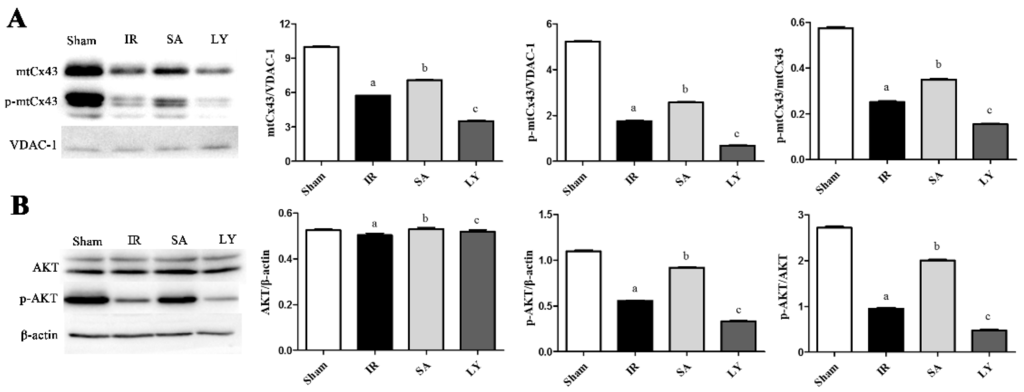 2.6. Effect of SA on mtCx43, p-mtCx43, AKT, and p-AKT Expression