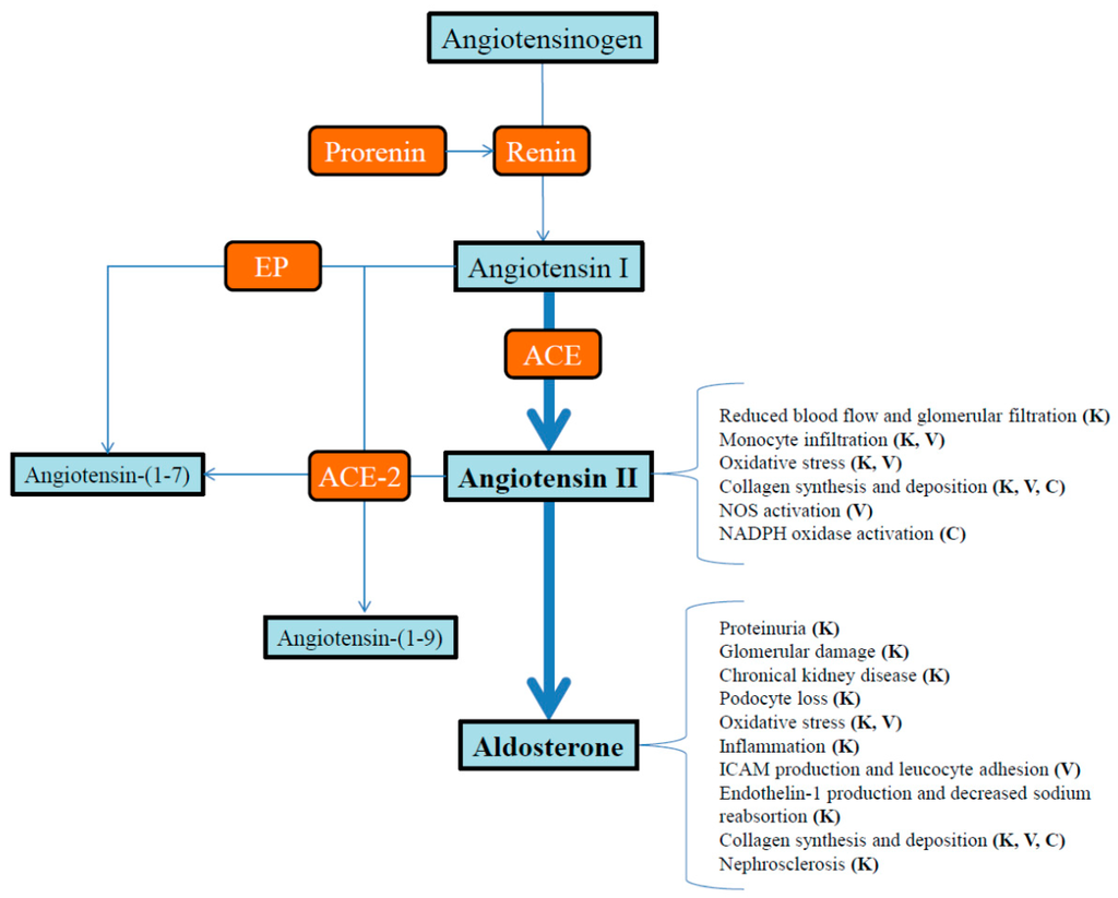 Detrimental effects of high levels of the RAAS molecules: angiotensin II and aldosterone during pathologic conditions such as, arterial hypertension and metabolic syndrome. K: Kidney; V: Vascular tissue; C: Cardiac tissue; EP: Endopedtidases; ACE: Angiotensin-converting enzyme; ACE-2: Angiotensin-converting enzyme 2.