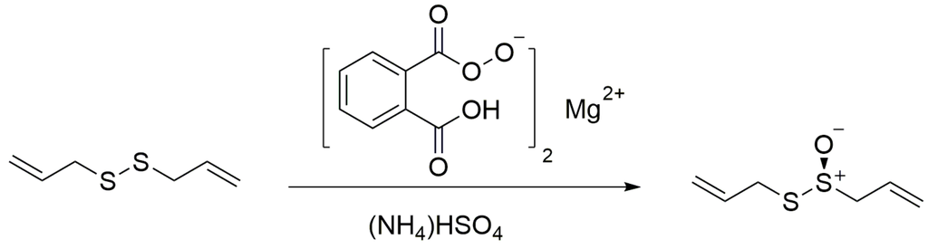 The allicin (purity HPLC 96%) used in this study was synthesized by oxidation of diallyldisulphide with magnesium monoperoxyphthalate using tetrabutyl ammonium hydrogensulfate as phase transfer catalyst (yield: 60%) (Figure 1). For the structural characterization, 1H-NMR and 13C-NMR were used (Figure S1).