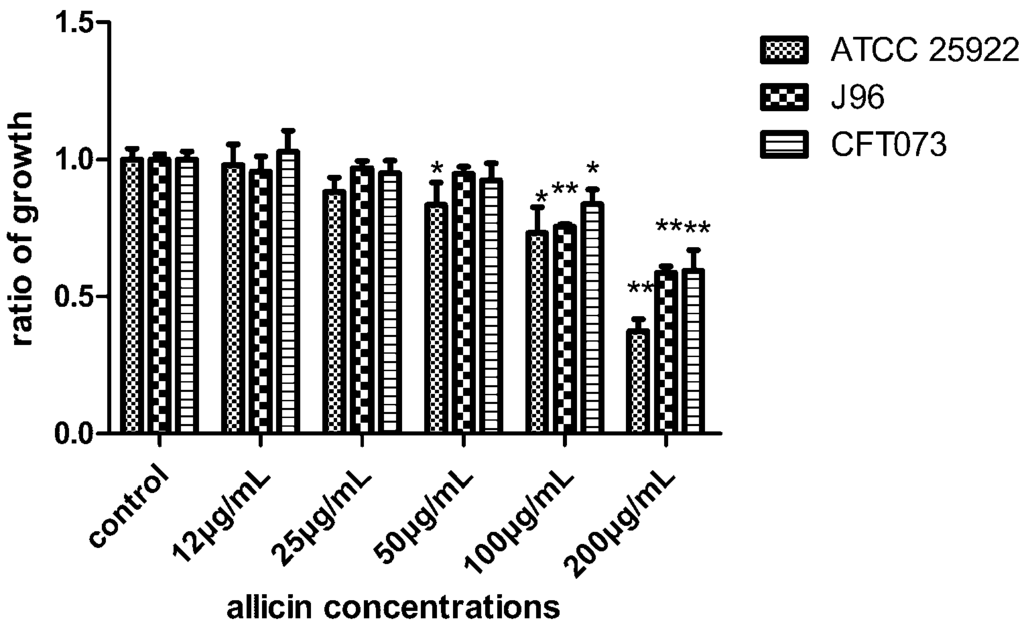 The growth of ATCC 25922, uropathogenic Escherichia coli (UPEC) J96, and CFT073 was evaluated by measuring optical density (OD) value at 600 nm after 24 h exposure to allicin and represented as growth ratio relative to control, set at 1. Bars indicate means ± SD of three independent experiments performed in triplicate, * p < 0.05, ** p < 0.01.