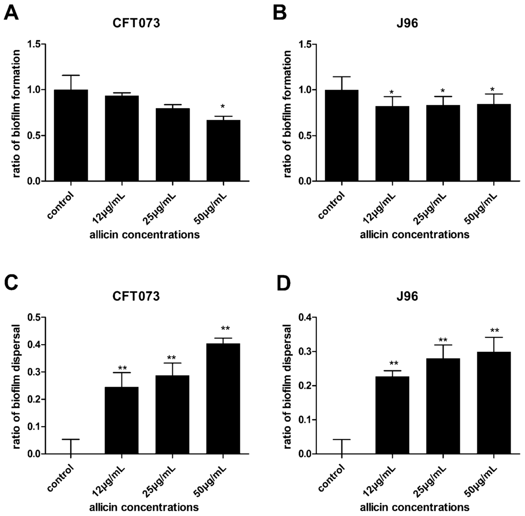 Biofilms are the basis of many persistent diseases []. Adhesion ability and motility are necessary for biofilm establishment [] and they are also important for maintaining virulence and pathogenicity of UPEC. Recently, persister cells were proved to be associated with biofilms, causing severe multidrug tolerance []. Therefore, it is important to carry out studies on novel strategies against bacterial biofilm. Natural products or food-derived agents are attracting great attention for their anti-biofilm abilities [,]. Garlic-derived compounds, such as ajoene and allicin, have shown great antibacterial potential. Ajoene can inhibit genes involved in pathogenicity controlled by quorum sensing []. In this study, we investigated another garlic-derived antimicrobial agent, allicin, for its ability to affect the biofilm formation and dispersal, as well as adhesion ability and swimming motility of UPEC CFT073 and J96 and the possible molecular mechanisms. Allicin, at the concentrations we used (12, 25 and 50 µg/mL) exhibited no effect on UPEC growth but decreased biofilm formation. The results are in agreement with previous studies wherein allicin decreased biofilm formation of Proteus mirabilis [] and Pseudomonas aeruginosa []. Moreover, a significant established biofilm dispersal was observed under the treatment of allicin. Allicin rapidly broke up the biofilms of UPEC within 1 h. Therefore, allicin may aid to release the persisters shielded in biofilm so that antibiotics are capable to kill these dormant cells, which are likely to be responsible for urinary tract infections [].