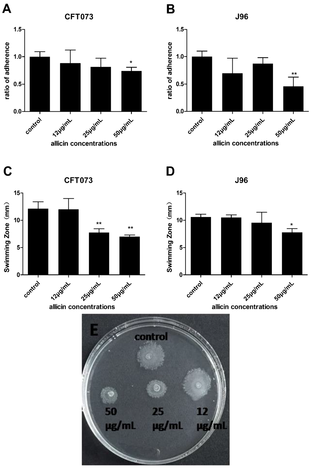 Effect of allicin on UPEC adhesion ability (A,B) and swimming motility (C,D). Ratio of adherence = Adherent bacteria of allicin treatment/Adherent bacteria of control. * and ** show statistically significant differences in values (p < 0.05 and p < 0.01, respectively) compared to the control. Representative image of UPEC CFT073 swimming zone in the absence and presence of allicin was presented (E).