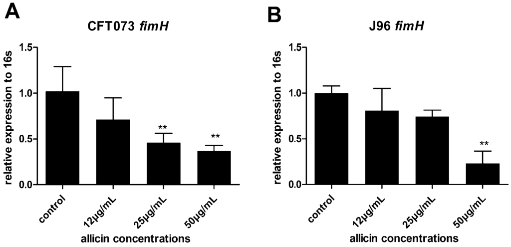 Type 1 pili adhesin FimH recognizes the glycoprotein uroplakin of bladder epithelial cells thereby mediates UPEC attachment in the bladder epithelium []. Thus, the effect of allicin on the expression of UPEC type 1 pili adhesin gene fimH was investigated by RT-qPCR. 50 µg/mL of allicin decreased 64% and 77% fimH expression of CFT073 and J96, respectively. 25 µg/mL of allicin decreased 54% of fimH expression in CFT073 (Figure 6A,B). Our result suggests that downregulating of fimH of UPEC CFT073 and J96 by allicin decreases UPEC adhesion ability.