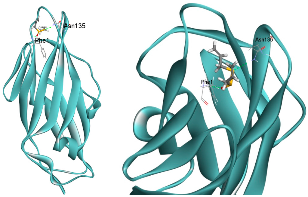 Possible binding sites of allicin within FimH were predicted by docking allicin into the FimH crystal structure (4BUQ) using the program Genetic Optimization for Ligand Docking (GOLD) (Cambridge Crystallography Data Centre, Cambridge, UK) in its implementation in Accelrys Discovery Studio Client (DS) version 3.1 (Accelrys Software Inc., San Diego, CA, USA). Hydrogen atoms were added to all ligands and the receptor prior to performing to the docking runs. The number of docking runs was set to 10, the “Detect Cavity” and “Early Termination” were set to be “False” to allow for the maximum number of runs. All other parameters were left at their default values. Gold scores, hydrogen bonds, and π-interactions of allicin were analyzed for the first pose of the 10 runs.