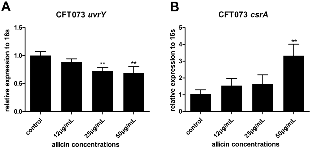 The TCS cognate response regulator UvrY plays a critical role in CFT073 biofilm formation. Its downstream protein CsrA serves as both a repressor of biofilm formation and an activator of biofilm dispersal []. UvrY facilitates the biofilm development while the over-expression of CsrA leads to inhibition of biofilm formation in CFT073 []. Thus the effects of allicin on the expression of UvrY and CsrA in UPEC CFT073 were investigated via RT-qPCR. Expression of UvrY was decreased approximately 32% while CsrA was increased by 3.3 fold in the presence of 50 µg/mL of allicin (Figure 8A,B), indicating that allicin might affect UPEC biofilm via the BarA-UvrY-CsrA pathway.