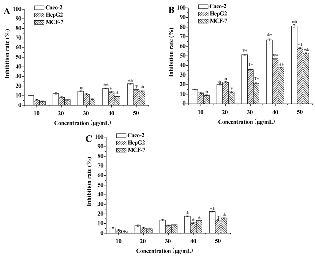 The cytotoxic effect of SBM extracts on three cancer cell lines. The cancer cells (Caco-2, HepG2 and MCF-7) were treated with various concentrations (0, 10, 20, 30, 40, 50 µg/mL) of GA (A), CGC (B) and EP (C) for 72 h, respectively. GA: gallic acid, CGC: cyanidin-3-O-glucoside chloride, EP: epicatechin. All results are the means ± standard deviation (SD) (n = 3). * p < 0.05 and ** p < 0.01, compared to the control group.