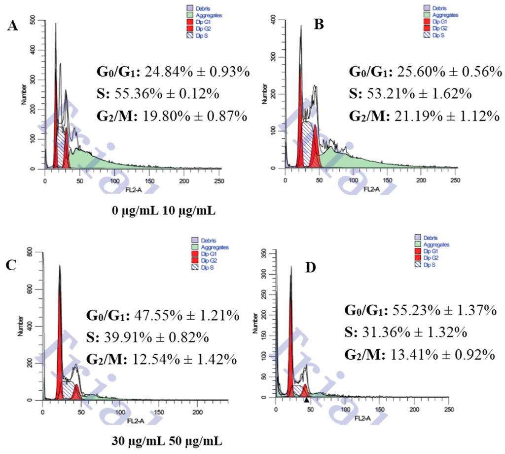 Caco-2 cells were seeded in six-well plates (1 × 106 cells/well). After 24 h plating and then 24 h serum starvation, cells were incubated with the CGC for 4 h with various doses. After that, the cells were harvested by trypsinization, washed thrice with cold phosphate-buffered saline (PBS) and fixed with cold 70% ethanol at 4 °C for 30 min. The cell pellet was incubated with 1.0 mL of PBS containing 100 μg propidium iodide (PI), 100 μg RNase A, and 0.1% Triton X-100 (Shanghai Baoman Biological Technology Co., Ltd., Shanghai, China) at room temperature in the dark for 30 min. The cells were analyzed by flow cytometry (BD, FACSAria II, San Jose, CA, USA).