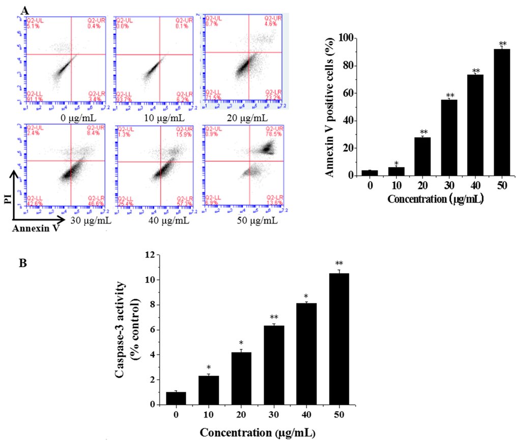 The analysis of Caco-2 cells apoptosis induced by CGC. (A) Flow cytometric analysis of MGC-803 cell apoptosis. Caco-2 cells were treated with CGC at 0 (control), 10, 20, 30, 40 and 50 μg/mL; (B) Caspase-3 activity in Caco-2 cells treated with 0, 10, 20, 30, 40 and 50 μg/mL of CGC, respectively. Caspase-3 activity was measured by caspase-3 colorimetric assay. All results are the means ± SD (n = 3). * p < 0.05 and ** p < 0.01, compared to control group.