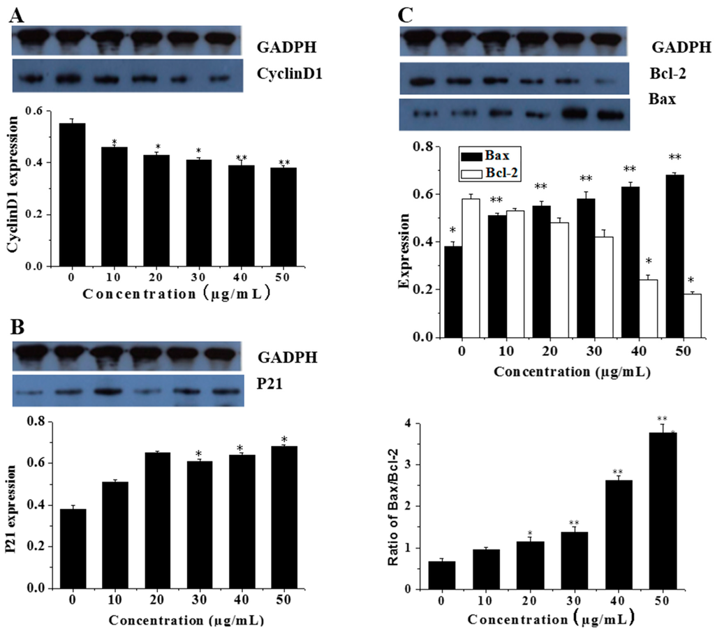 Caco-2 cells were treated with various concentrations of CGC for 24 h. Cell lysates were prepared in a buffer containing 0.2% (w/v) sodium dodecyl sulfate (SDS), 0.5% (v/v) Triton X-100, 0.5% (w/v) sodium deoxycholate, 1 mM phenylmethylsulfonyl fluoride (PMSF), and 1% protease inhibitor cocktail. Protein concentration was determined using bicinchoninic acid (BCA) reagent (Pierce Chemical Co., Rockford, IL, USA). The equal amount of protein was electrophoresed on 10% sodium dodecyl sulfate-polyacrylamide gel electrophoresis (SDS-PAGE) and transferred to nitrocellulose membranes. The membranes were blocked with PBS containing 5% low-fat milk for 1 h, incubated overnight with primary antibodies at 4 °C and subsequently incubated with secondary horseradish peroxidase-conjugated, goat anti-rabbit or goat anti-mouse IgG (Abcam, Cambridge, UK). The following antibodies were used: cyclin D1, p21, Bcl-2, Bax and GAPDH from Santa Cruz Biotechnology (Dallas, TX, USA). The blots were visualized using enhanced chemiluminescence (ECL) detection reagents (Amersham, Piscataway, NJ, USA).