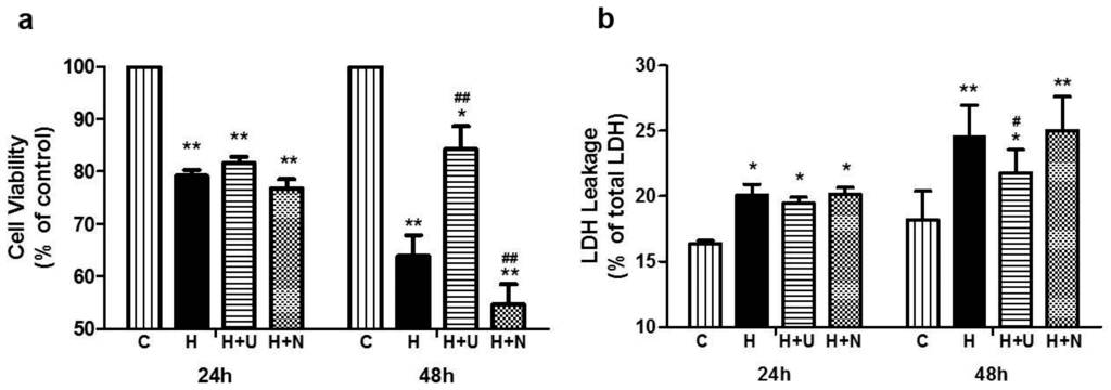 Figure 1. Responses of PC12 cells to DOR activation/inhibition under hypoxia. (a) Effects of hypoxia on cell viability. PC12 cells were exposed to hypoxia at 1% O2 for 24–48 h, and then the cell viability was measured by an MTT assay; (b) Effects of hypoxia on LDH leakage. PC12 cells were exposed to hypoxia at 1% O2 for 24–48 h, and then LDH leakage was measured. C: normoxic control. H: hypoxia. H + U: DOR activation with UFP-512 in hypoxic condition. H + N: DOR inhibition with naltrindole in hypoxic conditions. N = 3 in each group. * p < 0.05, ** p < 0.01 vs. control. # p < 0.05, ## p < 0.01 vs. H. Note that the cell viability was progressively reduced by the increase in hypoxic duration. DOR activation increased cell viability and decreased LDH leakage in hypoxic stress, while DOR inhibition further increased hypoxia induced injury.