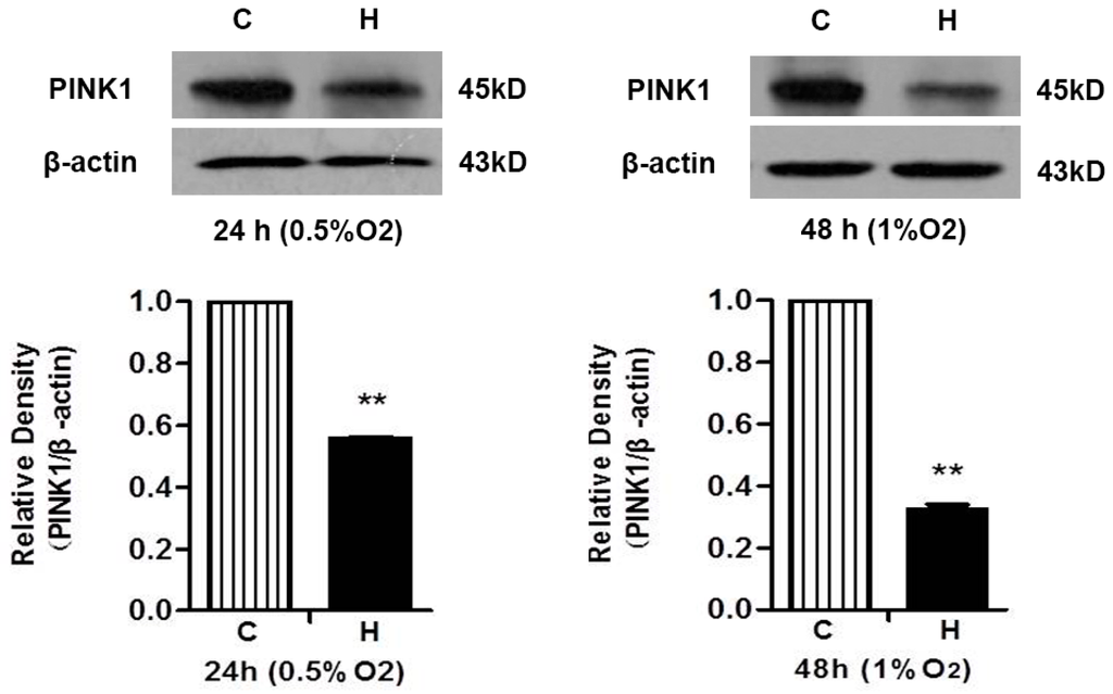 Figure 5. Hypoxia reduced PINK1 protein density in PC12 cells. The effects of hypoxia on PINK1 protein density at different oxygen levels for different durations was analyzed by Western blot. C: normoxic control. H: hypoxia. N = 3 for each group. ** p < 0.01 vs. control. Note that both hypoxic conditions significantly reduced the level of PINK1 protein, while there was a more significant reduction, when under hypoxia at 1% O2 for 48 h.