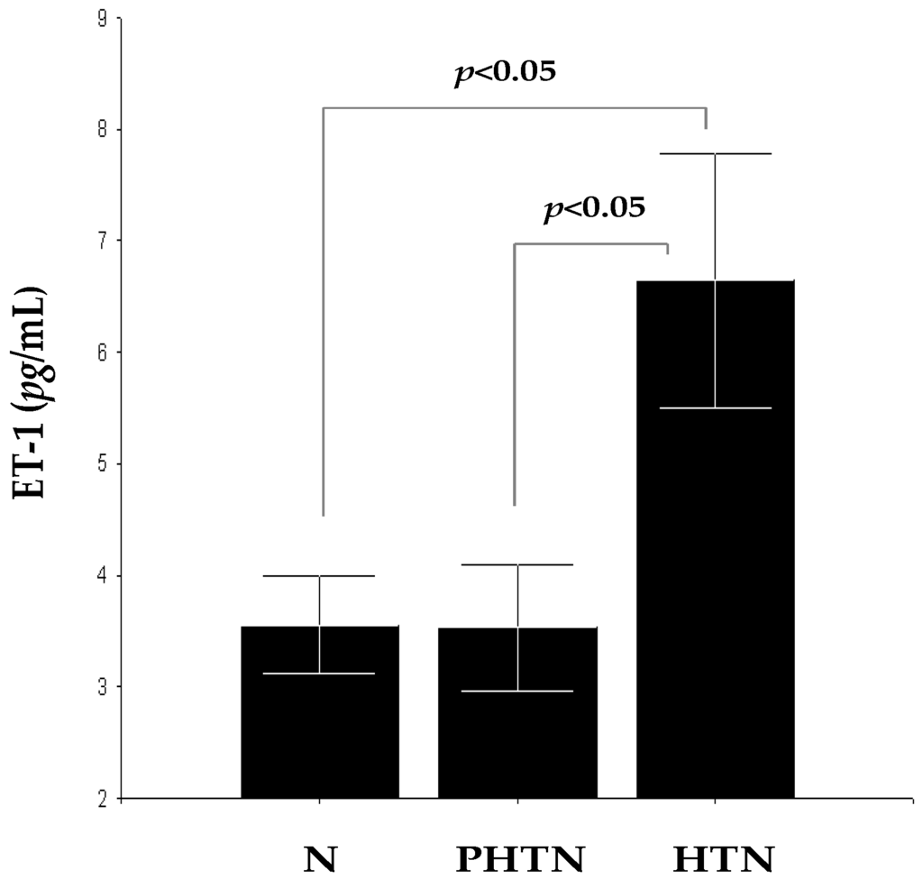 Serum concentrations of Endothelin-1 (ET-1) in pre-hypertensive (PHTN)/hypertensive (HTN) patients with T2D and healthy normotensive controls (N).