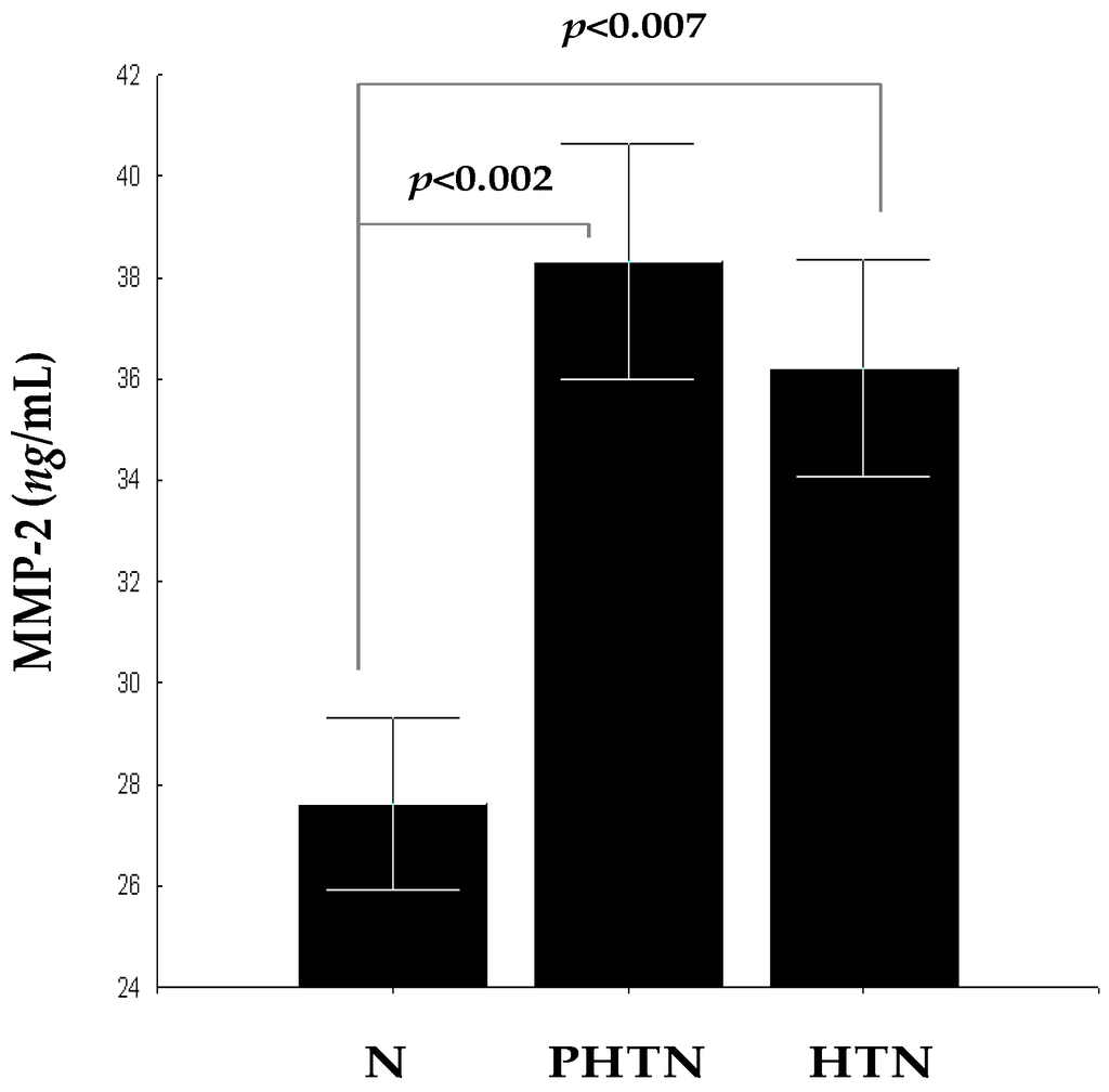 Concentrations of MMP-9 in PHTN 49.60 ± 12.37 ng/mL and HTN 35.55 ± 10.25 ng/mL were significantly higher compared to N 21.86 ± 7.47 ng/mL (F = 59.35, p < 0.0001 and F = 19.78, p < 0.0002). There were also statistical differences between PHTN and HTN, as it should be noted that, in HTN, concentrations of MMP-9 were significantly lower (F = 11.95, p < 0.002) (Figure 3). MMP-9, similar to MMP-2 is induced at the early stages of hypertension, and this is probably favorable to alleviate the initial vascular tensile stress. Later, the effects of MMP-2 and MMP-9 are counterbalanced by expression of tissue inhibitors of MMPs (TIMPs) and their concentrations began to decline.