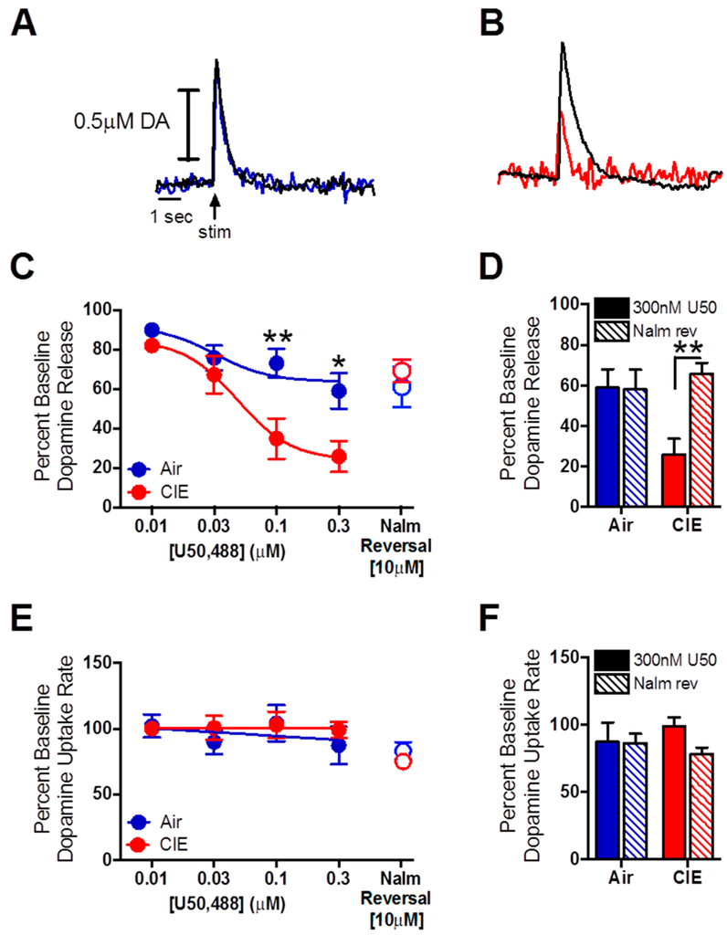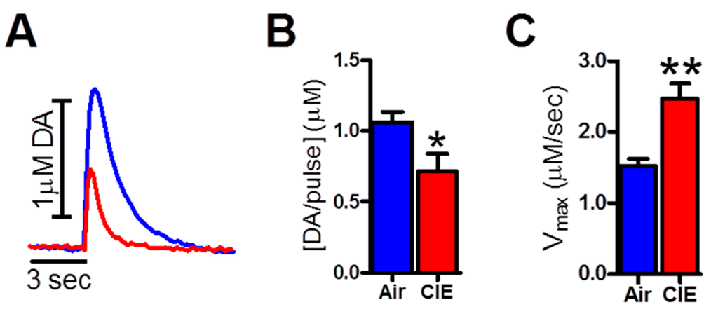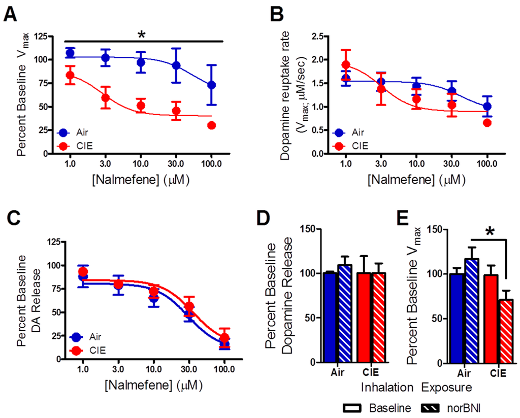 2.2. Nalmefene Slowed Dopamine Uptake Rates More in Brain Slices from CIE-Exposed Mice Than Controls