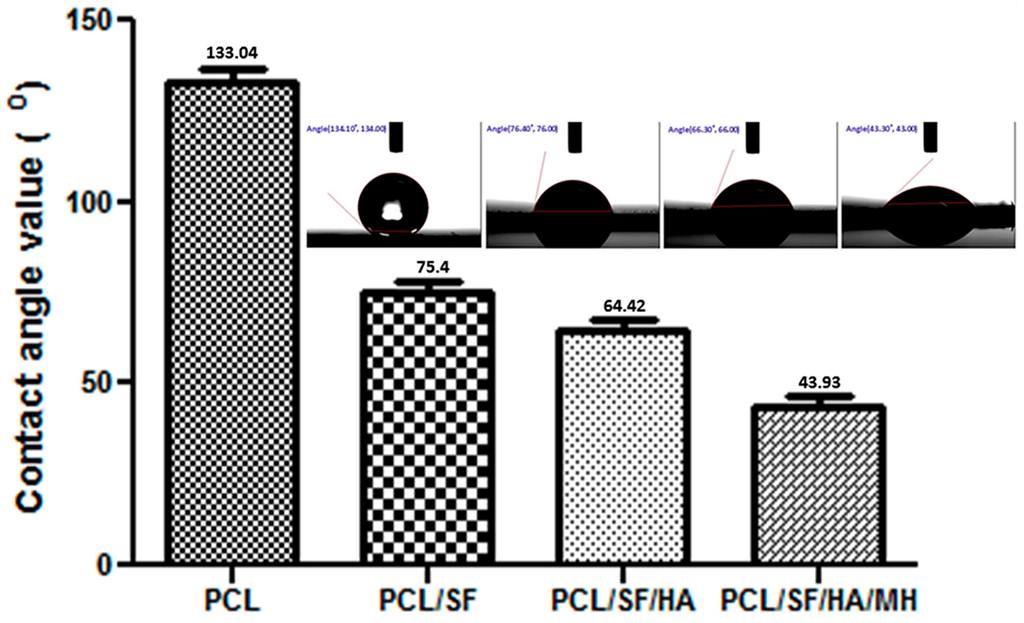 The topography of nanoparticles plays an important role in the regulation of primary cell activities such as attachment and proliferation of cells in tissue engineering []. Field emission scanning electron microscope (FESEM) micrographs of nanoparticle showed nano-scaled and uniformed particles prepared under controlled conditions (Figure 1). The particle diameters were obtained in the range of 0.54 ± 0.12 to 3.2 ± 0.18 µm (Table 1). Contact angle measurement revealed that the addition of SF to PCL became hydrophilic because hydroxyl group in SF has the ability to form H bonds with H2O molecule for interpreting a significant increase in hydrophilicity as seen in PCL/SF with a contact angle of 75.4 ± 9.45° as compared to 133.1 ± 12.4° in PCL nanoparticles (Figure 2). Contact angle value of PCL/SF/HA/MH particles was significantly (p ≤ 0.001) reduced compared to pristine PCL nanoparticles. Upon addition of HA biomolecules, MH changes further hydrophilic with a contact angle of 64.42 ± 13.4 and 43.93 ± 30.8° for PCL/SF/HA and PCL/SF/HA/MH particles. The water absorbance ratio is directly proportional to the hydrophilic properties of the nanofibrous scaffolds which support prevention of dryness and the build-up of exudates on wounds [].
