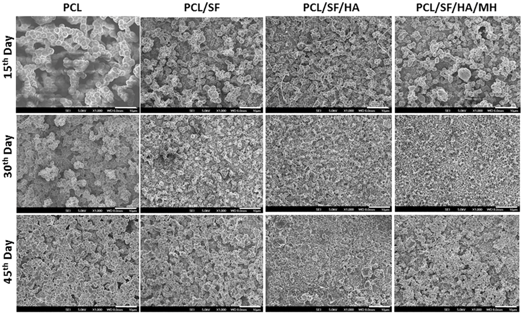 The degradation properties play an important role in biomolecule selection and strategy in tissue engineering [,,,]. Thus, the biocomposite scaffolds must meet definite model and suitable principles, with biocompatibility, tensile strength in particular cases of biomaterials. The ability of polymer biocomposites in a plethora of applications requires the optimal selection of matrix polymer chemistry, and matrix filler interaction for the degradation of materials []. The degradation of pristine PCL results from the hydroxylation and separation of excessive molecular mass chains, followed by altering carbon dioxide and H2O in the atmosphere of water. The structural variations of PCL, PCL/SF, PCL/SF/HA and PCL/SF/HA/MH particles on day 15, 30 and 45 are presented in Figure 4. After 15 days of degradation, for the PCL/SF, PCL/SF/HA, and PCL/SF/HA/MH particles and pore constructions remained similar and a small part of particles was scratch. The PCL/SF, PCL/SF/HA and PCL/SF/HA/MH nanoparticles were broken and finally, degenerate into small particles after day 30 and 45. This is caused by the hydrolysis and diffusion of small polymers from the samples, which effect in a disconnected construction and the diffusion of H2O molecule into the samples at initial degradation. Over a period of time the lengthy chains of polymers hydrolyzes and degrades the particles to breakdown into small parts. The weight loss was initiated by the degradation progress, which is evident that oligomeric substance able to dissolved in the medium from the polymer surface by the polymer chain hydrolysis. Degradation for 10–40 days of pristine PCL particles was 3.8% and 10.88% and the rate of degradation was much slower than PCL/SF particles (Figure 5). After day 30 and 40, addition of SF, the degradation rate PCL/SF, PCL/SF/HA and PCL/SF/HA/MH enriched and the weight loss was 10.65% and 13.33%, and 12.87% and 15.74%, and 14.8% and 17.65% respectively. Pristine PCL shows reduced rate of degradation then PCL/SF, PCL/SF/HA and PCL/SF/HA/MH particles. The crystallization of pristine PCL is greater as compared to electrosprayed PCL/SF, PCL/SF/HA and PCL/SF/HA/MH particles.