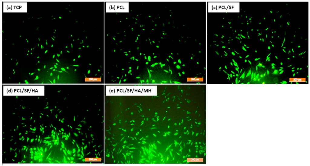 Cell morphology and 5-Chloromethylfluorescein diacetate CMFDA dye extrusion image to analyses the cell morphology on (a) TCP, (b) PCL (c) PCL/SF (d) PCL/SF/HA (e) PCL/SF/HA/MH micro/nanoparticles at 10× magnifications. The green color fluorescence indicate live cell morphology.