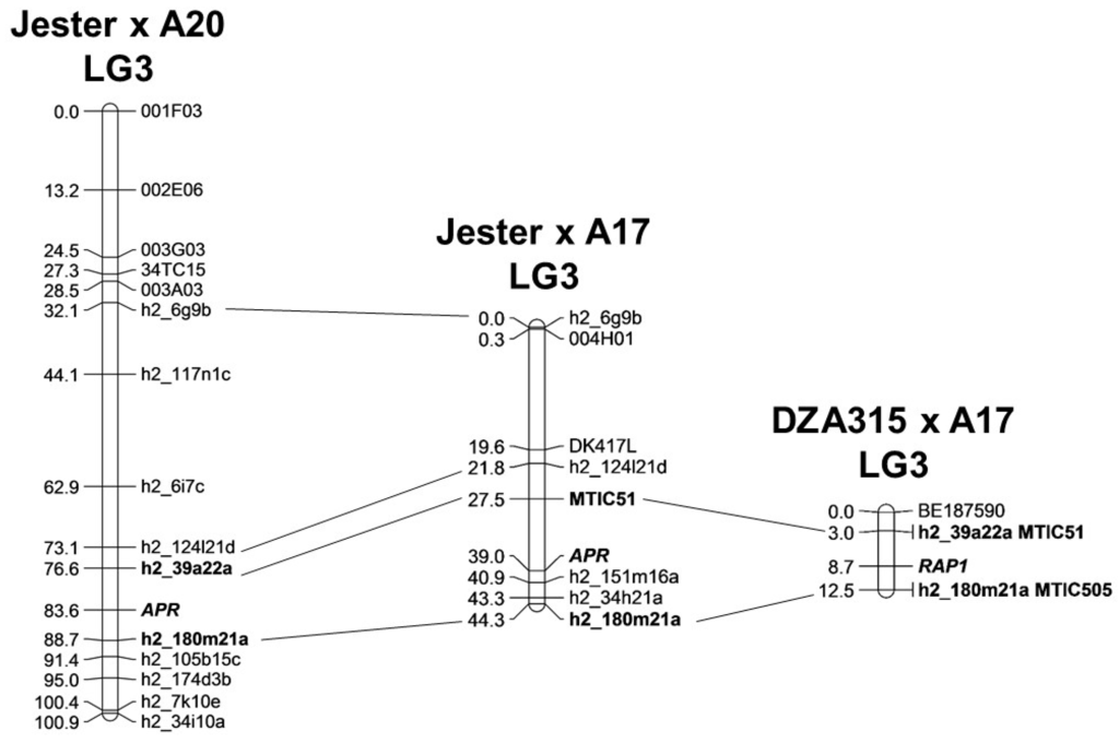 Linkage group 3 was constructed for both mapping populations using a set of 15 and 8 markers for the Jester × A20 and the Jester × A17 population respectively, using Multipoint v1.2 (Institute of Evolution, Haifa University, Haifa, Israel) as described by Kamphuis et al. [].