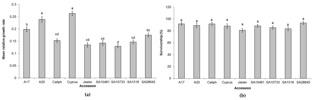 (a) Mean relative growth rate (MRGR) of pea aphid nymphs on nine Medicago truncatula accessions over four days. Values are mean and standard error of ten replicates. Accessions that do not share the same letters indicate significant differences in pea aphid MRGR from the other accessions by Tukey Kramer HSD test (p < 0.05); (b) Survivorship of pea aphid nymphs on nine M. truncatula accessions over four days. No significant differences were observed in survivorship by Tukey Kramer HSD test (p < 0.05).