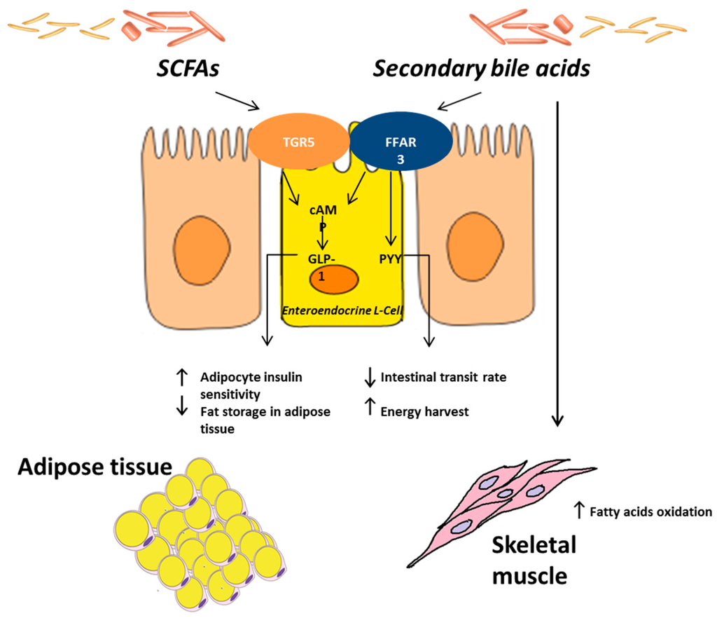 Gut microbiota and energy balance. The gut microbes can benefit the host by extracting energies from otherwise non-digestible carbohydrates and plant polysaccharides via enzymes not encoded by humans. Short-chain fatty acids (SCFAs) modulate intestinal gluconeogenesis via the gut-brain neuronal circuit, involving GPR41 (free fatty acid receptor, FFAR3) and through the cyclic adenosine monophosphate (cAMP)-dependent pathway. Butyrate is able to regulate the appetite in the central nervous system by stimulating the liberation of peptide YY (PYY) and the satietogenic hormone glucagon-like peptide 1 (GLP-1) from enteroendocrine L-cells. PYY decreases the intestinal transit rate and increases the harvest of energy from the diet, while GLP-1 improves adipocyte insulin sensitivity and remarkably reduces fat storage in adipose tissue. Gut microbes can also control the metabolic activity of the host by affecting the composition and the abundance of certain bile acid species. In the ileum microbes deconjugate cholic and chenodeoxycholic acids, which escape intestinal uptake, and are converted into secondary bile acids. Bile acids can also act as signaling molecules by binding cellular receptors such as the bile-acid-synthesis controlling nuclear receptor farnesoid X receptor (FXR), G-protein-coupled receptors (GPCR), and TGR5. While primary bile acids can impair glucose metabolism by binding FXR, secondary bile acids, by binding TGR5, improve glucose homeostasis and increase energy expenditure in skeletal muscle.