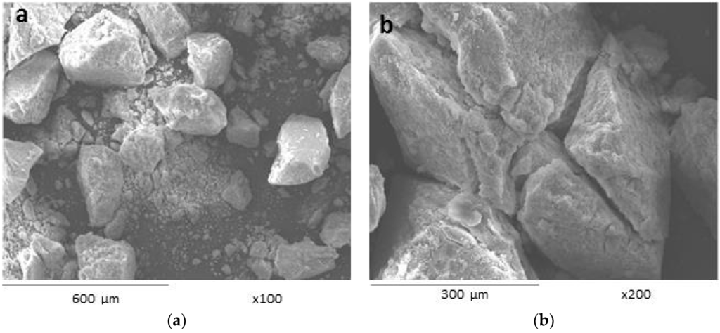 The polysaccharide yield was 4.4 (% w/w dry biomass basis), nearest to the values reported in the diatom Gomphonema olivaceum (3% w/w) [] and in the benthic seaweed Sargassum qingdaoense (7.2% w/w) [], but lower than the values reported for the planktonic specie Spirulina platensis (13.6% w/w) []. These differences could be due to the extraction methods used and/or the type of species investigated. The extracted polysaccharide consisted of a white-colored powder with fine and granulated parts. Scanning electron microscopy (SEM) can be a useful tool to analyze the surface morphology of polysaccharide powder. The SEM micrographs showed that the lyophilized Navicula sp. polysaccharide is an amorphous solid (Figure 1). The observed particles were mostly aggregates of irregular shapes with sharp angles similar to those reported for other sulfated polysaccharides [].