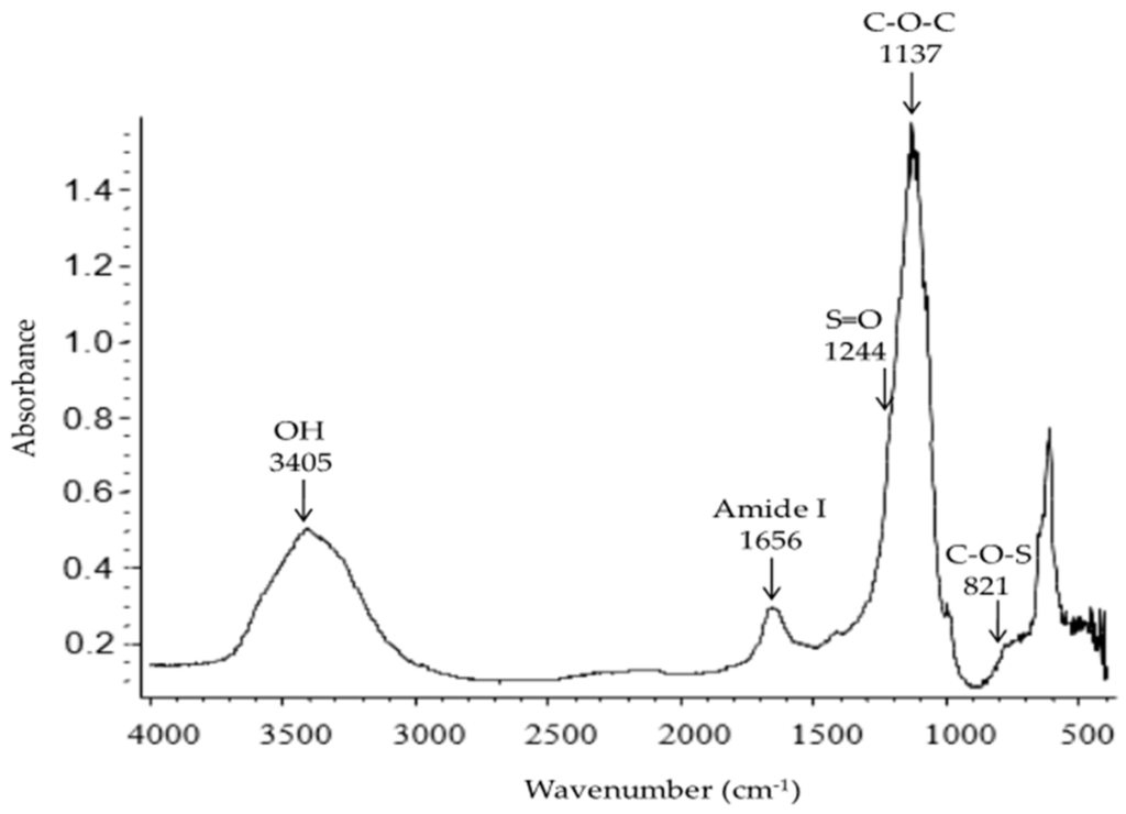 The Fourier transform infrared (FT-IR) spectrum of the sulfated polysaccharide extract showed five distinct bands at wave numbers ranging from 3405–821 cm−1 (Figure 2). The bands were assigned to particular functional groups according to previously published literature [,]. The spectrum of this polysaccharide showed the typical infrared footprint of carbohydrates. The band in the region of 3405 cm−1 corresponds to the stretching vibration characteristic of OH groups; a similar band around this wavenumber was observed for sulfated polysaccharides from green and brown seaweeds [,]. The band related to amides associated with the protein was detected at 1656 cm−1; this band has also been detected in other microalgae []. The most important band was found at 1137 cm−1, assigned to C–O–C bending; similar bands were reported for sulfated polysaccharides from brown and red seaweeds [,]. The band corresponding to the S=O vibration (1244 cm−1) possesses a low intensity; this result could be due to the low sulfate content detected on the sample (0.33% w/w) as reported in Table 1. Some studies have reported the presence of this band in sulfated polysaccharides extracted from the diatom Navicula directa [] and from the three major groups of seaweeds (green, brown and red algae) [,,,]. Finally, the band at 821 cm−1 was attributed to C–O–S stretching vibrations; sulfated polysaccharides extracted from some green and brown seaweed species also showed a band specific to the C–O–S group [,,,,] around a similar wavelength as in our study.