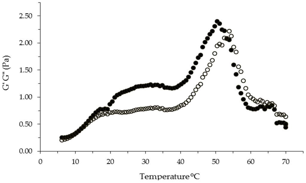 Temperature ramp for sulfated polysaccharide at 1% (w/v) in the presence of trivalent ions of FeCl3 at 0.4% (w/v) at 1 Hz and 2% strain. G’ (●), G” (○).