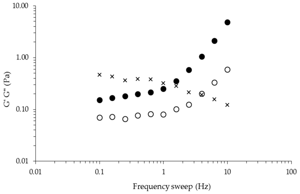 Mechanical spectra of sulfated polysaccharide gel at 1% (w/v) induced by FeCl3 at 0.4% (w/v). Measurements at 2% strain and 25 °C. G’ (●), G” (○), tan δ (×).