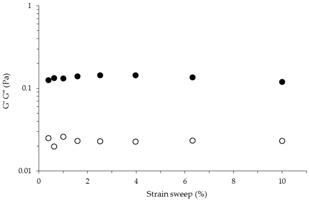 Strain sweep of sulfated polysaccharide gel at 1% (w/v) induced by FeCl3 at 0.4% (w/v). Measurements at 1 Hz and 25 °C. G’ (●), G” (○).
