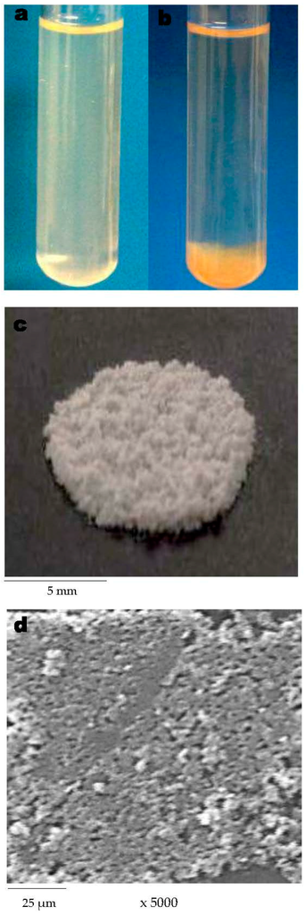 In Figure 6 the sulfated polysaccharide solution before (a) and after (b) FeCl3 addition is observed. The yellow gel-like substance was lyophilized (Figure 6c) and analyzed by SEM (Figure 6d). SEM micrographs of the lyophilized polysaccharide gel present a compact pore structure, with an irregular pore size of approximately 150 nm. The gel formed with this trivalent metal consisted of fine-stranded networks with strand thickness on the nm scale. In could be assumed that the SEM preparation method does not affect the sizes of the domains of the network structure. Nevertheless, it is important to note that lyophilized gel does not allow visualizing the original wet-polymeric network but it can be useful to investigate the dried microstructure of the polysaccharide gels.