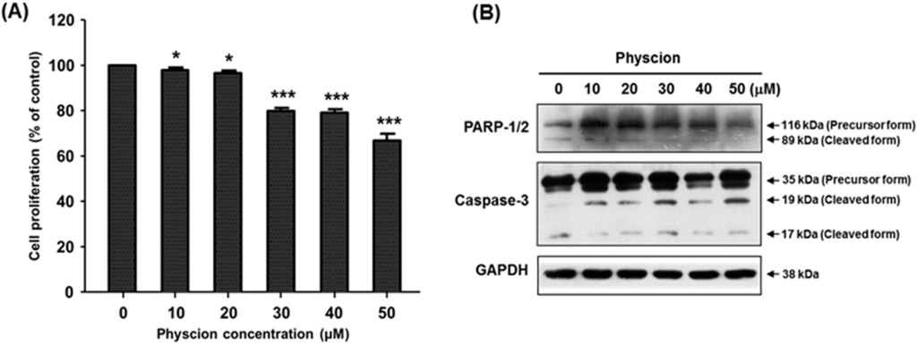 - Hong, J.Y.; Chung, H.J.; Bae, S.Y.; Trung, T.N.; Bae, K.; Lee, S.K. Induction of cell cycle arrest and apoptosis by physcion, an anthraquinone isolated from rhubarb (rhizomes of Rheum tanguticum), in MDA-MB-231 human breast cancer cells. J. Cancer Prev. 2014, 19, 273–278. [Google Scholar] [CrossRef] [PubMed]