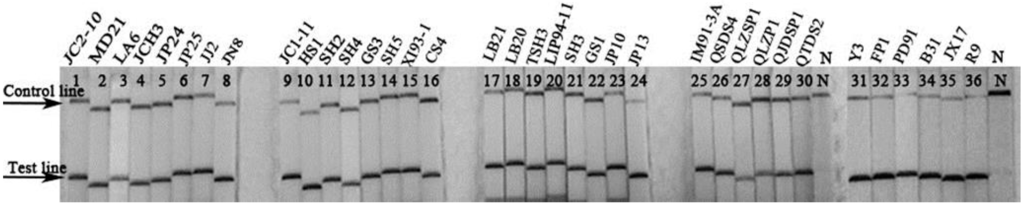 Results of recombinase polymerase amplification with lateral flow (LF-RPA) assay in 36 strains of Borrelia burgdorferi (B. burgdorferi) detection. N stands for negative control (water); Name of each strain was listed above the strips.