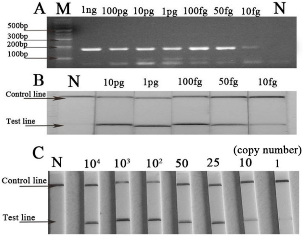 Detection of a series of diluted B. burgdorferi DNA by basic recombinase polymerase amplification (B-RPA) and LF-RPA. (A) The B-RPA results shown by agarose gel electrophoresis. M stands for marker, N stands for negative control (water); (B) The LF-RPA results shown by Hybridetect 2T dipsticks. N stands for negative control (water); (C) Detection of B. burgdorferi DNA from 104 copies to one copy by LF-RPA assay.