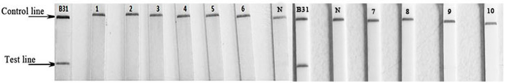 Result of LF-RPA assay in non-Borrelia strain detection. B31: positive control; 1, Ehrlichiae; 2, Bartonella henselae; 3, Anaplasma phagocytophilum; 4, Coxiella burnetii; 5, Leptospira 56603; 6, Escherichia coli BL21; 7, Leptospira 56602; 8, Leptospira 56601; 9, Leptospira 56613; 10, healthy blood DNA; N, negative control (water).