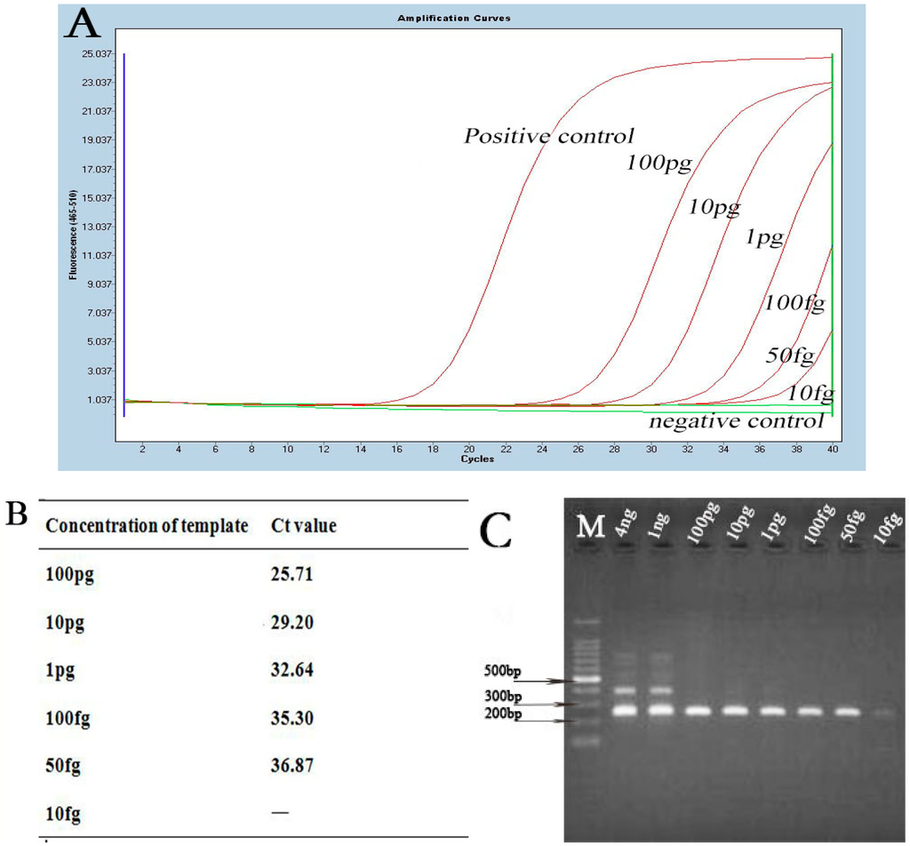 Detection of a series of diluted B. burgdorferi DNA by real-time qPCR and nested-PCR. (A) The results of diluted DNA detected by real-time qPCR. Ct value for each concentration is shown in this figure (B); (C) results of diluted DNA detected by nested-PCR. M stands for marker.