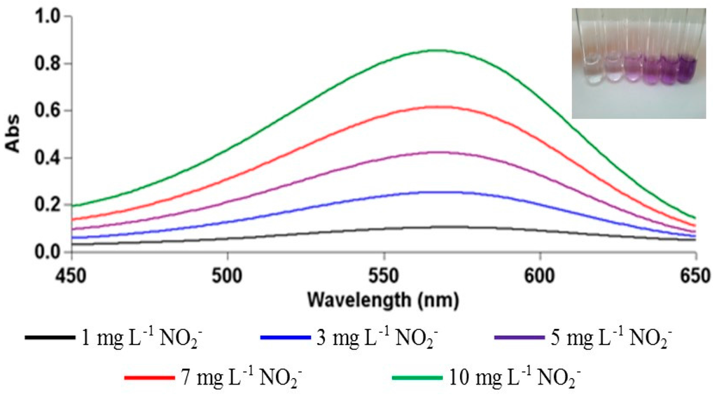 4.7. Preparation of Colorimetric Sensor for NO2− Determination