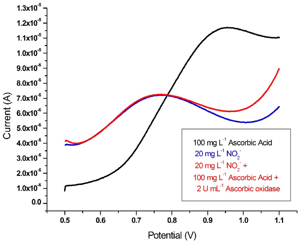 - Mani, V.; Periasamy, A.P.; Chen, S.-M. Highly selective amperometric nitrite sensor based on chemically reduced graphene oxide modified electrode. Electrochem. Commun. 2012, 17, 75–78. [Google Scholar] [CrossRef]