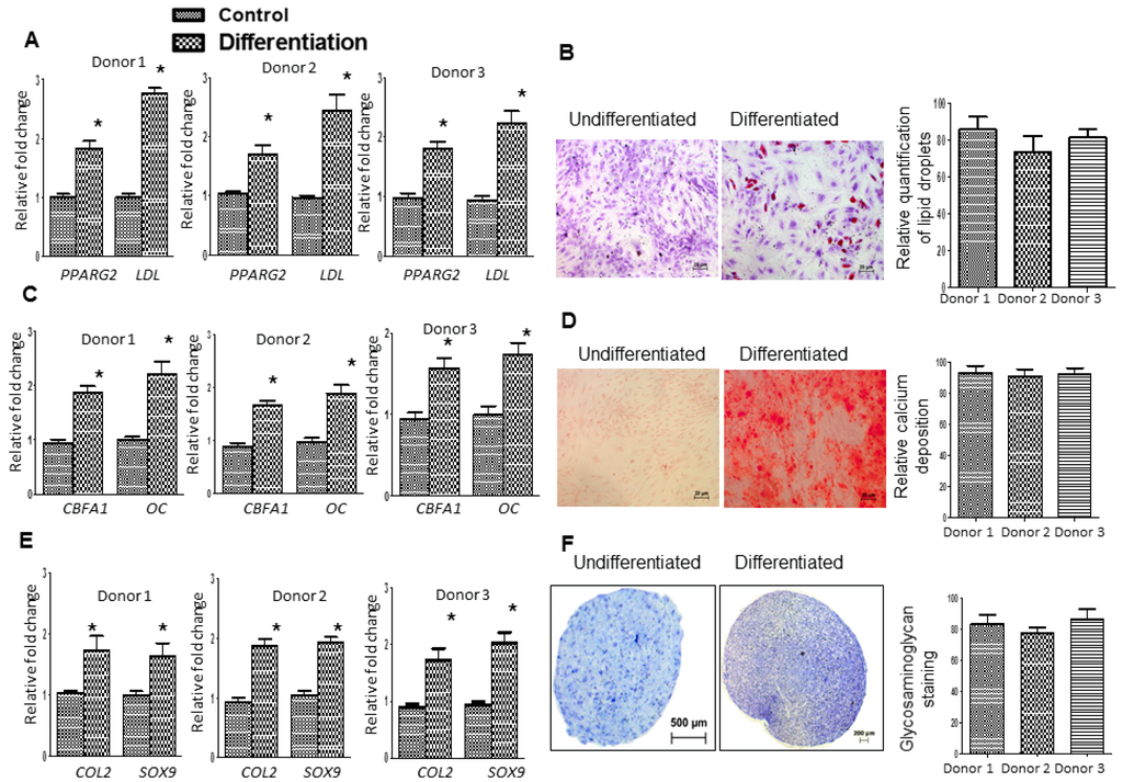 Lineage-specific differentiation capacity of ad-MSCs. (A,B) RT-qPCR was done to evaluate adipogenesis markers, Peroxisome proliferator-activated receptor γ 2 (PPARG2), and Lipoprotein lipase (LPL). Quantification of lipid droplets is shown in (B) after staining undifferentiated and differentiated samples with Oil Red O. Scale bar: 20 µm; (C,D) RT-qPCR was done to evaluate osteogenesis markers, Core-binding factor subunit α1 (CBFA1) and Osteocalcin (OC). Undifferentiated and differentiated donor ad-MSCs were stained with Alizarin red S. In osteogenic cultures mineralization was visible as red-stained calcium deposition in (D). Scale bar: 20 µm; and (E,F) RT-qPCR was done to evaluate chondrogenesis markers such as type II collagen (COL2) and Sox9. Undifferentiated and differentiated donor ad-MSCs were stained with Toluidine blue O. In chondrogenic cultures staining of the proteoglycans (purple) was visible. Quantification of glycosaminoglycans production is shown. Scale bar: Undifferentiated: 500 µm; Differentiated: 200 µm. * p < 0.05.