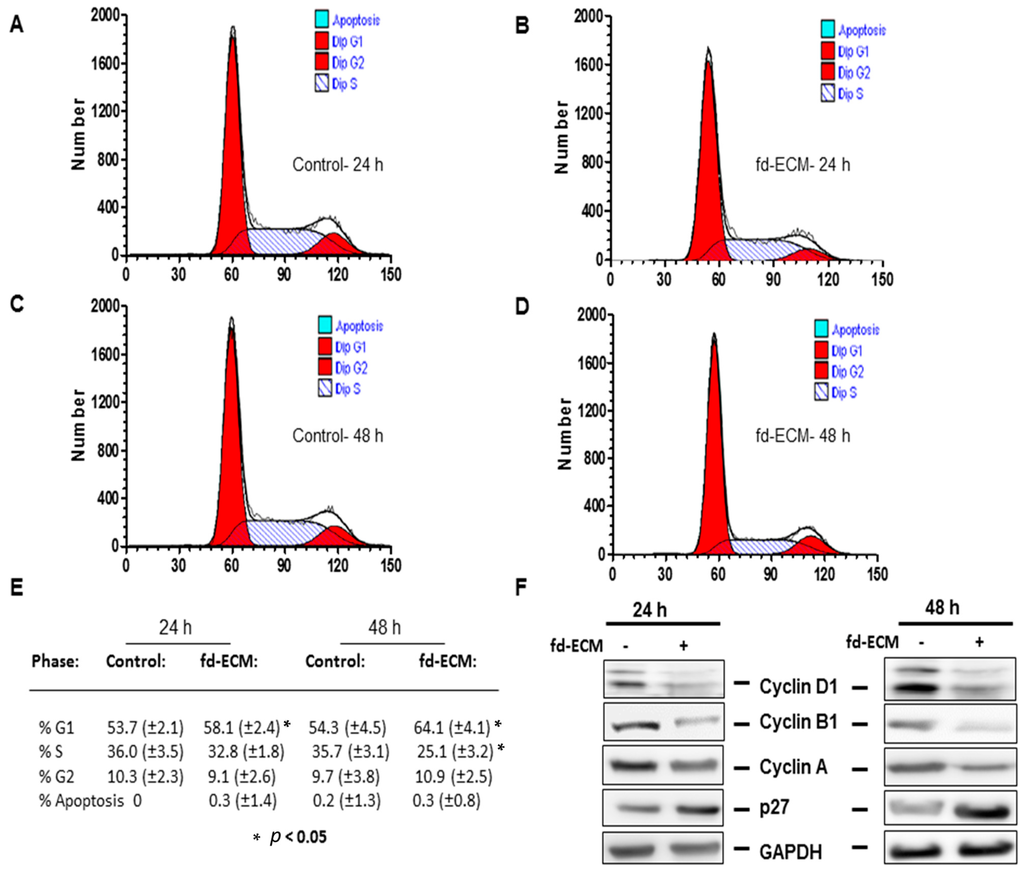 In addition, a semi-quantitative assessment of whether the fd-ECM affects ad-MSCs’ cell cycle progression was made. Cell cycle analysis was done by flow cytometry on ad-MSCs plated on plastic (control) and fd-ECM after propidium iodide labeling. Significant differences in both the G1 and S phases were observed between control cells and those plated on fd-ECM. After 24 h of incubation there appear to be a G1 cell-cycle arrest when cells were cultured on fd-ECM (Figure 5A,B,E). Approximately 10% of the ad-MSCs were detected in the G2 phase of the cell cycle. After 48 h of incubation, there was also a significant increase in ad-MSCs in the G1 phase while ad-MSCs in the S phase decreased significantly (Figure 5C–E). Immunoblot analysis showed a downregulation of cyclin D1, cyclin B1, and cyclin A, and an increase in p27 (Figure 5F). This downregulation, coupled with the decrease in Ki67 expression, is not associated with actively cycling ad-MSCs but with those undergoing differentiation. These results suggest that the fd-ECM does not promote ad-MSC proliferation but induces differentiation of ad-MSCs.