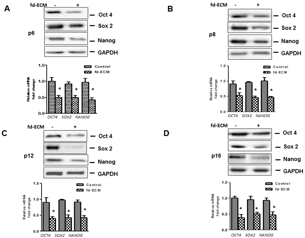 Fd-ECM downregulates pluripotency genes expression over several passages. Ad-MSCs were cultured on plastic dishes (−) or on fd-ECM (+) for the indicated passages (A) Protein and mRNA levels of Oct4, Sox2, and Nanog were determined in ad-MSCs lysates and mRNA at passage 6; (B) Protein and mRNA levels of OCT4, SOX2, and NANOG were evaluated in ad-MSCs lysates and mRNA at passage 8; (C) Protein and mRNA levels of OCT4, SOX2, and NANOG were evaluated in ad-MSCs lysates and mRNA at passage 12; and (D) Protein and mRNA levels of OCT4, SOX2, and NANOG were determined in ad-MSCs lysates and mRNA at passage 16. * p < 0.05.
