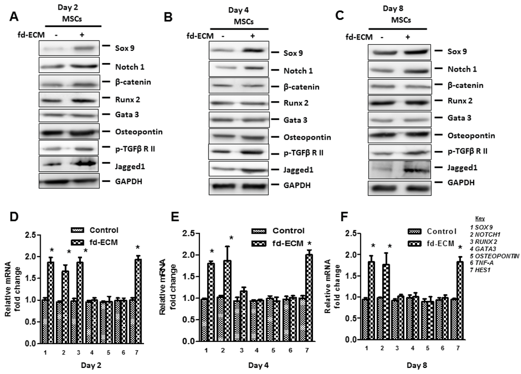 Fd-ECM induces chondrogenic differentiation in ad-MSCs. Ad-MSCs were cultured on plastic dishes (−) or on the fd-ECM (+) for the indicated days (A–C) Immunoblot analysis of Sox9, Notch1, β-catenin, Runx2, Gata3, Osteopontin, p-TGFβRII, and Jagged1 in ad-MSCs lysates after two, four, and eight days of incubation on plastic dishes and on the matrix; (D–F) RT-qPCR was used to analyze the levels of SOX9, NOTCH1, RUNX2, GATA3, OSTEOPONTIN, TNF-α, and HES1 in ad-MSCs mRNA after two, four, and eight days of incubation on plastic dishes and on fd-ECM. * p < 0.05.
