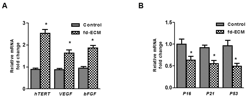Anti-senescence effect of fd-ECM on ad-MSCs. (A) Ad-MSCs were cultured on plastic dishes (−) and on fd-ECM (+) for 48 h, harvested, and total RNA extracted. RT-qPCR was performed to evaluate human Telomerase Reverse Transcriptase (hTERT), VEGF, and bFGF mRNA levels; (B) Ad-MSCs were cultured on plastic and on an fd-ECM for 48 h, harvested, and total RNA extracted. RT-qPCR was performed to evaluate P16, P21, and P53 mRNA levels; (C) Ad-MSCs were cultured on plastic (−) and on fd-ECM (+), harvested, and immunoblot analysis was performed to evaluate VEGF, bFGF, p21, and p53 protein levels; and (D) ad-MSCs were cultured on plastic (−) and on an fd-ECM (+) and immunoblot analysis was performed to evaluate cleaved caspases 3 and 9 protein levels. * p < 0.05.