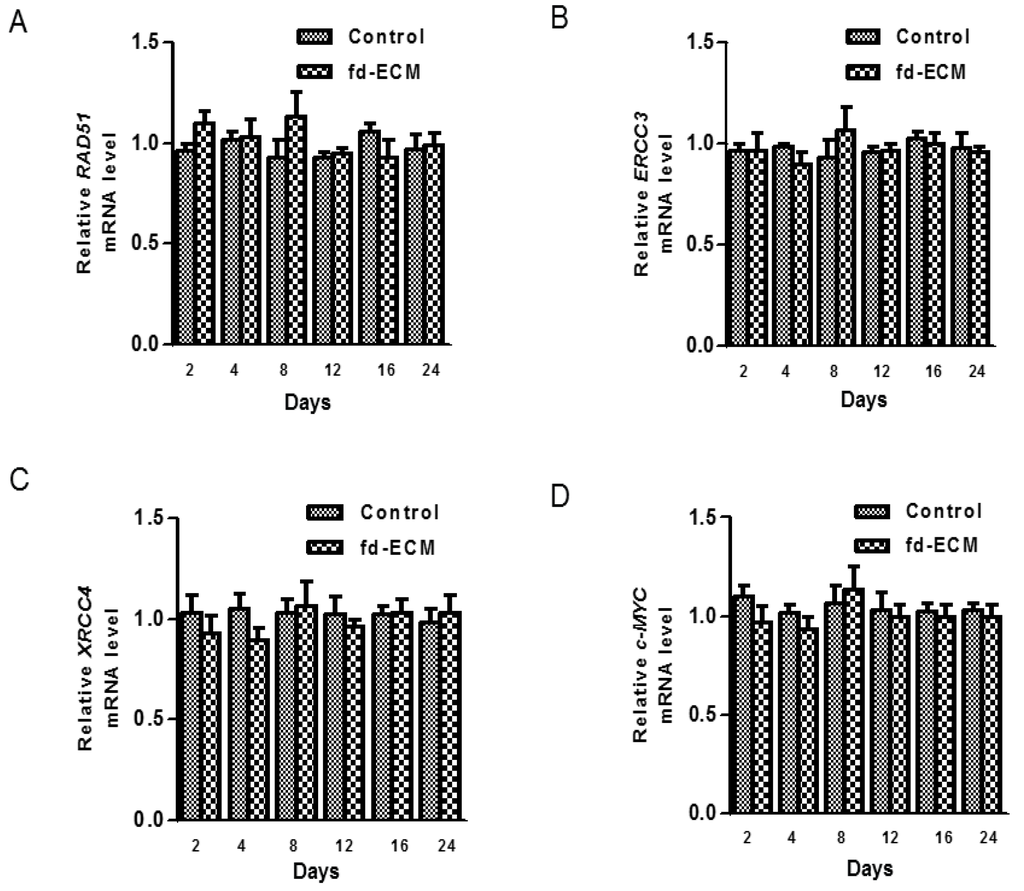 Since ad-MSCs are to be used for various therapeutic procedures, their biosafety needs to be evaluated. Therefore we analyzed the expression of several genes such as RAD51, ERCC3, XRCC4, and c-MYC in MSCs cultured on fd-ECM. For fd-ECM to be considered for further studies on tissue engineering applications, the transformation capacity of MSCs cultured on fd-ECM had to be evaluated. The mRNA levels of the transformation markers, ERCC3, RAD51, c-MYC, and XRCC4 were analyzed using RT-qPCR and the fd-ECM had no significant effect on the mRNA levels of the transformation markers (Figure 10A–D).