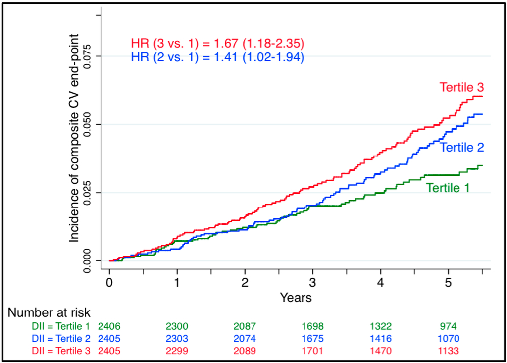 Cumulative incidence of CVD in the PREDIMED study [28] according to tertiles of the DII score.