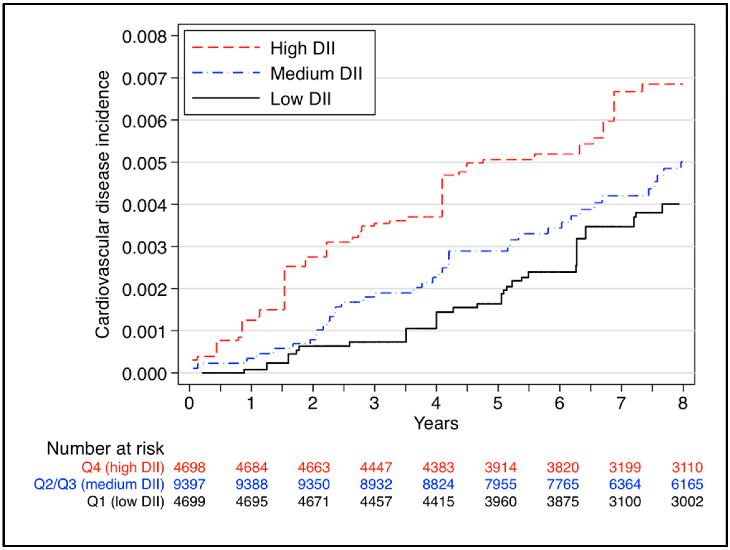 Cumulative incidence of CVD in the the SUN cohort [29] according to quartiles of the DII score (merging the two intermediate quartiles to build a medium category). The data are adjusted for sex, age, hypertension, dyslipidemia, diabetes, smoking, family history of premature CVD, and total energy intake.