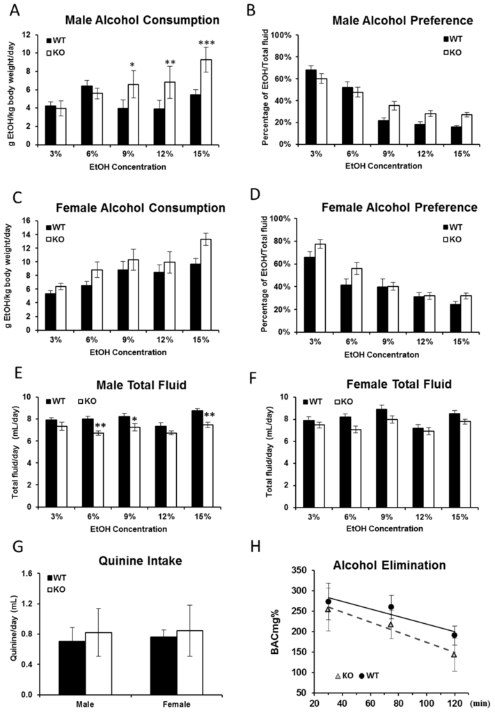 EtOH consumption and preference, quinine consumption and EtOH metabolism in Fkbp5 KO and WT mice. A significant increase in alcohol consumption (A) in male mice was observed in the KO mice at 9%, 12% and 15% EtOH concentrations when compared to WT mice. No significant increases in alcohol consumption (C) in female mice or preference (B,D) in either sex were observed. Lower total fluid consumption was observed (E) in male mice, but not (F) in female mice during the EtOH consumption test. KO and WT mice did not differ in quinine consumption (G). No differences in alcohol metabolism were found between KO and WT mice (H). *, p < 0.05, **, p < 0.01, ***, p < 0.001.
