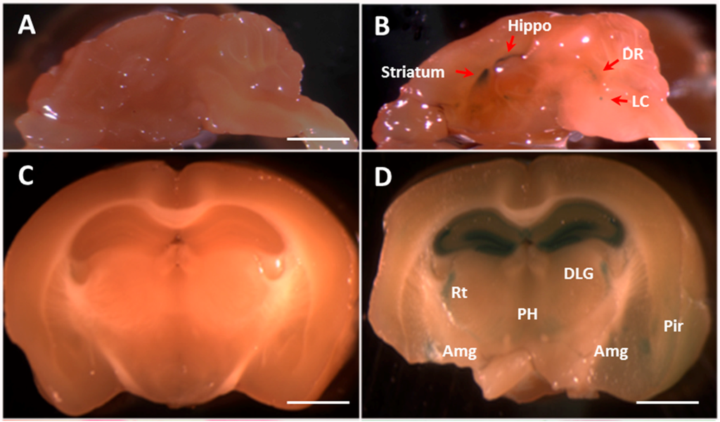 Age-matched Fkbp5−/− (n = 6) and littermate control (n = 6) mice of both sexes were used for morphological and histological studies. Fkbp5 gene expression in the whole brain was determined at 1 and 4 months of age. Whole brains were collected, and the LacZ gene product, β-galactosidase activity, was detected using X-gal [,]. After images were collected, the whole brain or brain slices were fixed in 10% neutral-buffered formalin. Brains were paraffin embedded, sectioned (5 µm) and stained with hematoxylin and eosin following standard protocols [,].