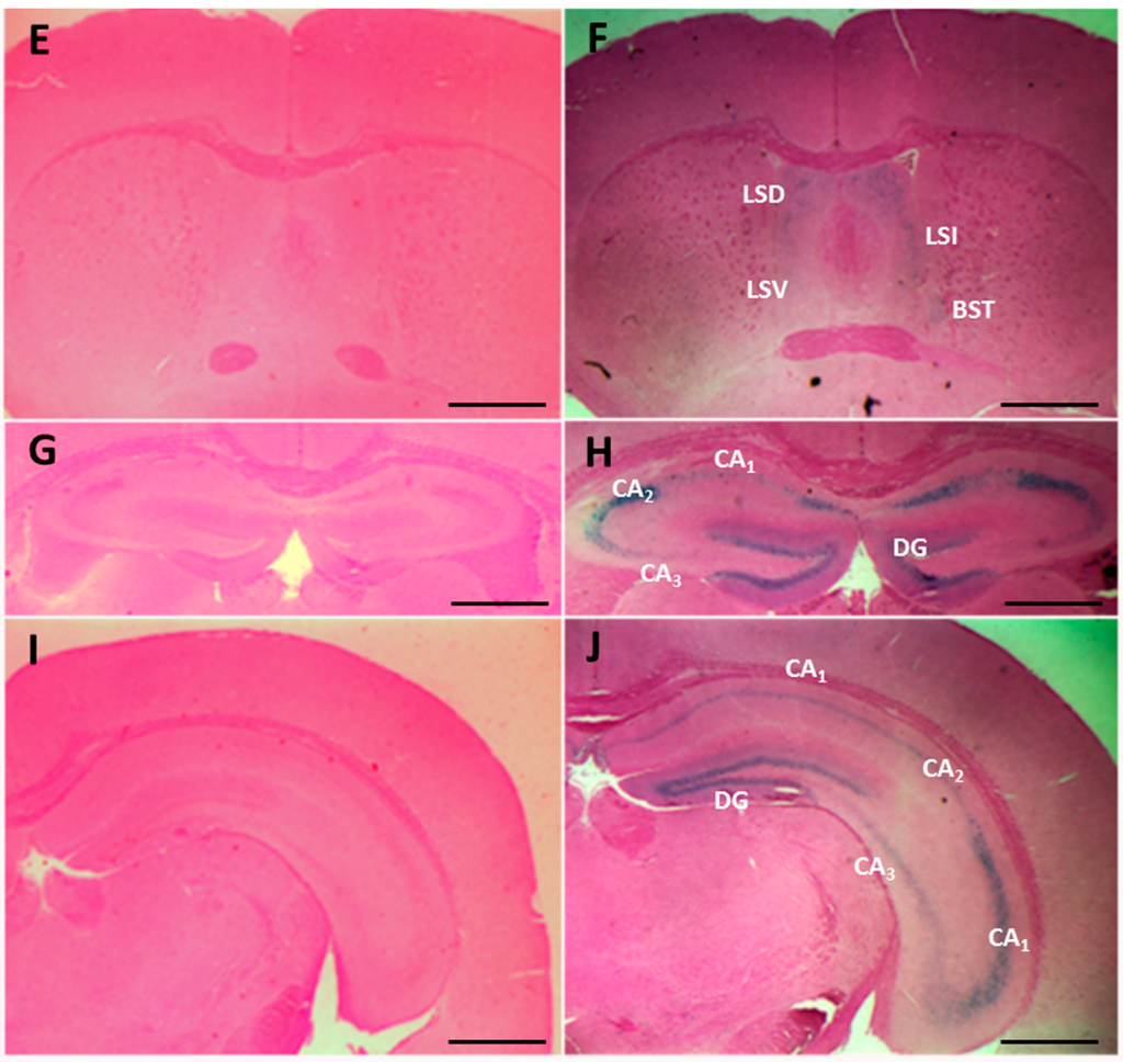 FKBP5 has been found to have reduced expression in individuals with PTSD []. Fkbp5-deficient mice were generated using a gene-trapping approach [] in which the LacZ reporter gene was inserted. Previous studies have also shown that the murine Fkbp5 gene is expressed in various tissues, including brain and peripheral tissue. We therefore charted the Fkbp5 gene expression pattern in KO mice by staining for the LacZ gene product. In the brains of one-month-old Fkbp5 KO mice, LacZ staining revealed Fkbp5 expression in the hippocampus, striatum, dorsal raphe (DR) and locus coeruleus (LC) (Figure 2B). In four-month-old Fkbp5 KO mice, LacZ staining was observed in the hippocampus and additional brain regions, such as amygdala (Figure 2D). Whole brain LacZ staining followed by sectioning and eosin red staining in four-month-old KO mice revealed that Fkpb5 was highly expressed in the lateral septum, which includes lateral septal nuclei dorsal (LSD), ventral (LSV) and intermediate (LSI) (Figure 2F); bed nucleus of the striatum terminalis (BST) (Figure 2F); and hippocampus (Figure 2H,J). In the four-month-old hippocampus, LacZ staining suggested that Fkbp5 is highly expressed in CA1, CA2, CA3 and the dentate gyrus (DG) (Figure 2D,H,J). Consistent with the absence of the LacZ reporter gene, WT control mice did not exhibit any LacZ staining (Figure 2A,C,E,G,I).
