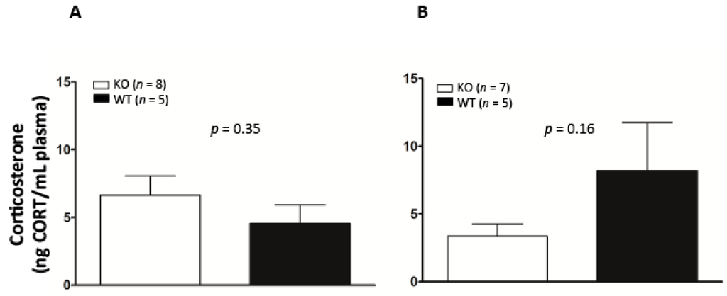 Basal serum corticosterone (CORT) levels in male (A) and female (B) WT and KO mice. No significant difference was found between genotypes.