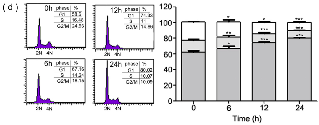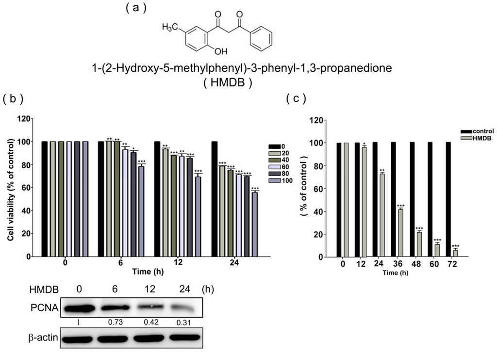 HMDB inhibited proliferation of HeLa cells via inducing the G1 cell cycle arrest. (a) The chemical structure of HMDB; and (b) the effect of HMDB on cell viability of HeLa cells. Cells were treated with a variety of dosages of HMDB for 0–24 h or (c) with 40 µM HMDB for different time periods. Cell survival was determined using 3-(4,5-dimethylthiazol-2-yl)-2,5-diphenyltetrazolium bromide (MTT) assay and trypan blue exclusion assays, respectively. The protein levels of PCNA were determined by Western blotting; and (d) a histogram of the cell cycle distribution. HeLa cells were treated with 40 μM HMDB for 0, 6, 12, and 24 h. Cell distribution at G1, S and G2/M phase was determined using flow cytometry. All of the data resulted from repeating independent experiments three times and results are expressed as mean ± SE. Values were statistically significant (versus HMDB treatment) for * p < 0.05, ** p < 0.01, *** p < 0.001 as compared with the control group.